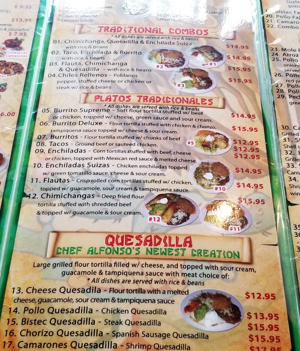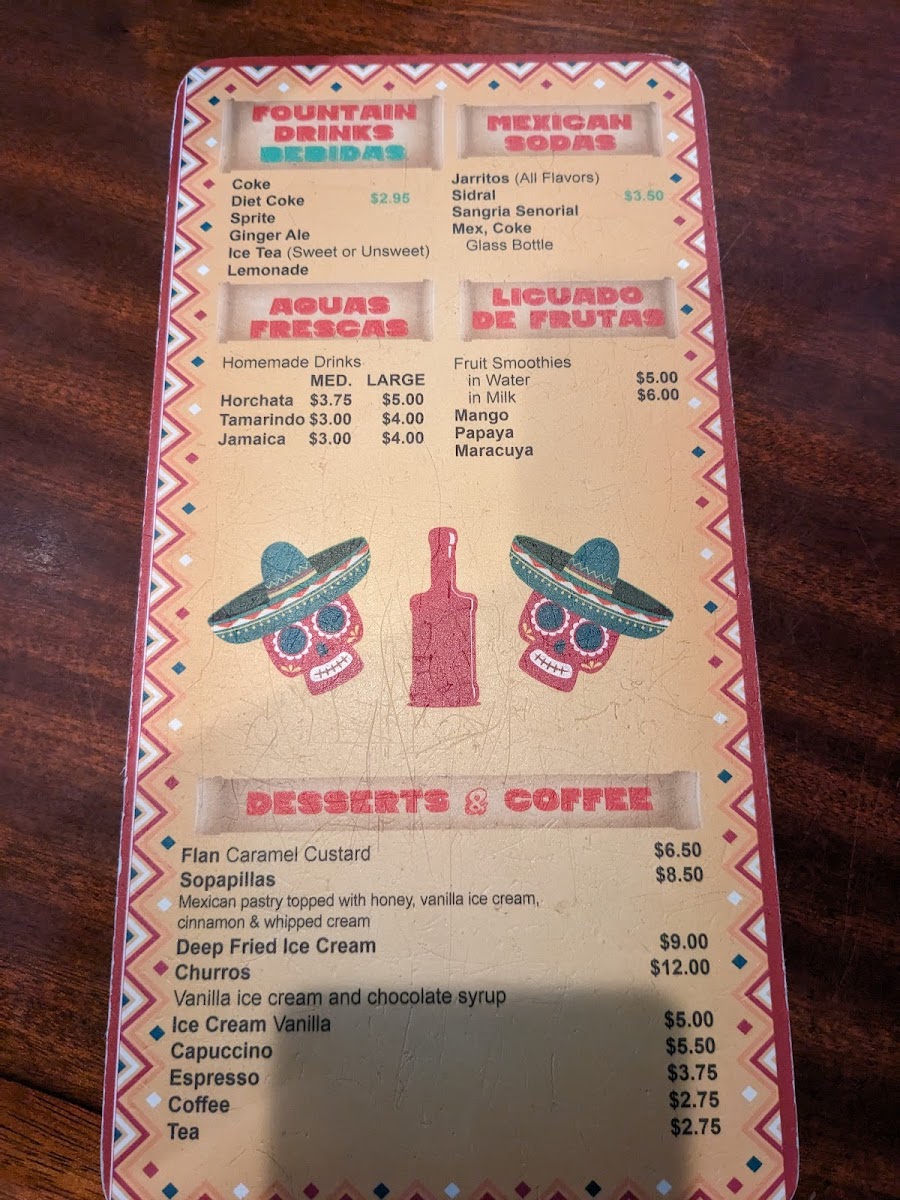 The drink selection complements the food well, offering refreshing choices like frozen margaritas and sangría, perfect for enhancing a warm evening or gathering with friends. For dessert, options like flan and sopapillas provide a gentle finish to the meal, adding to the overall sense of homey satisfaction that the menu conveys.